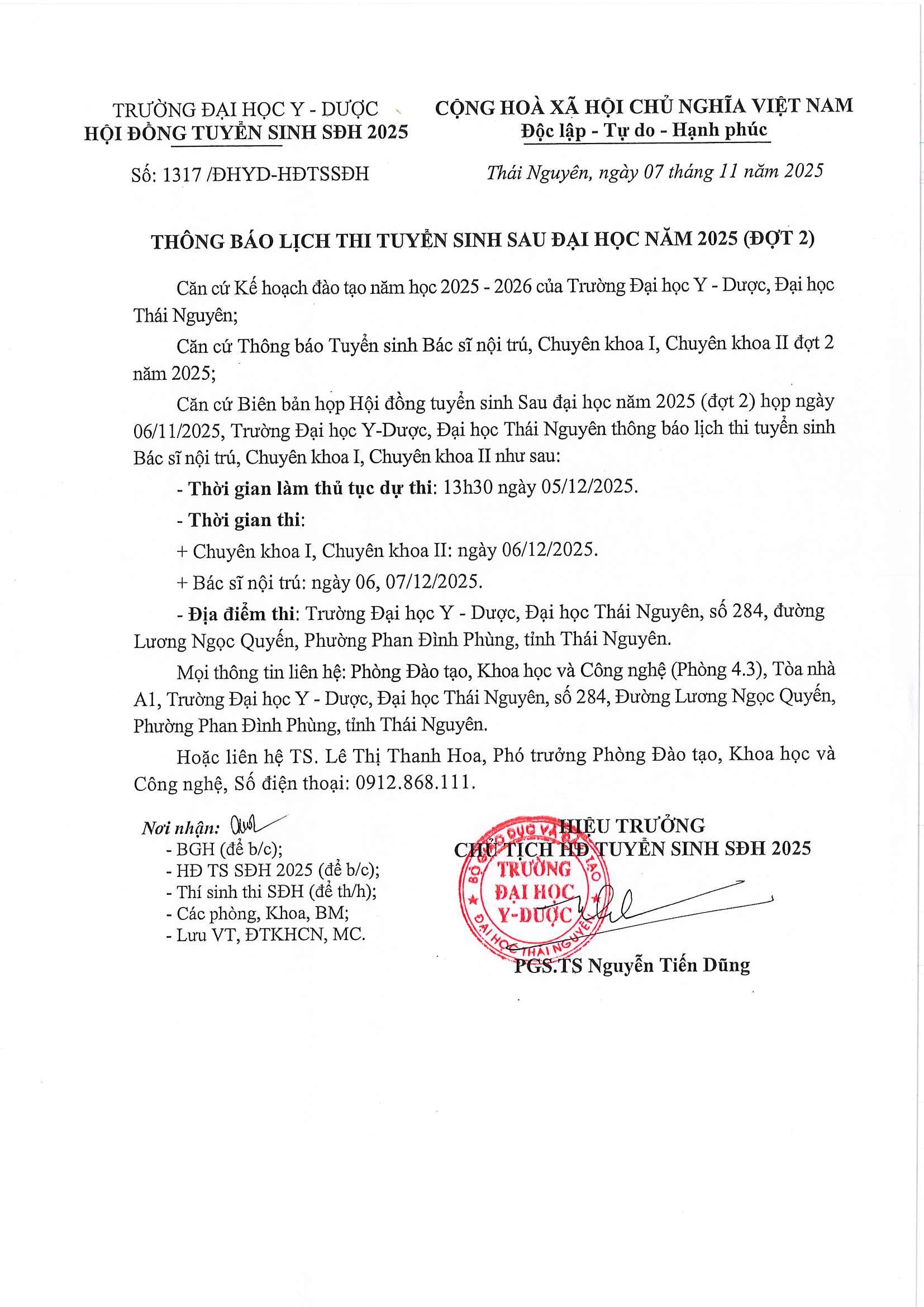 Trường Đại học Y - Dược, Đại học Thái Nguyên thông báo lịch thi tuyển sinh sau đại học năm 2025 (Đợt 2)