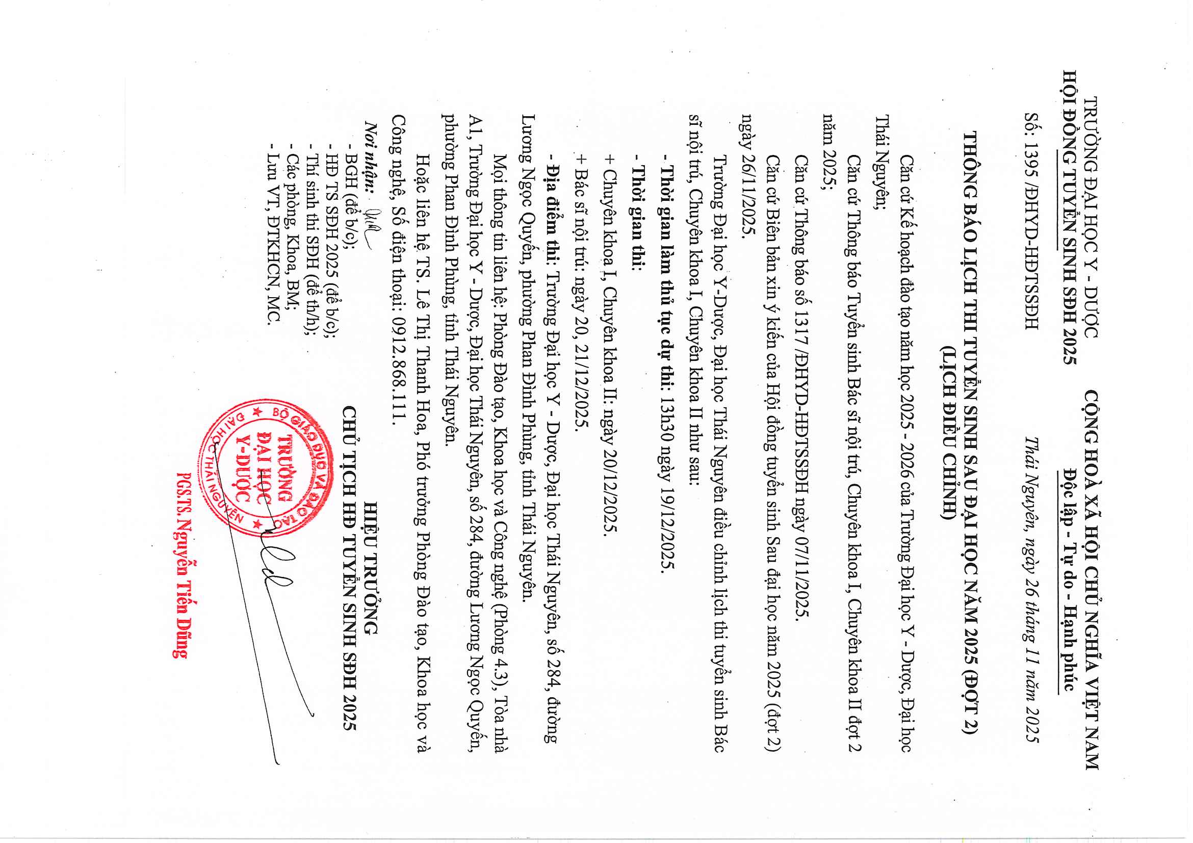 Trường Đại học Y – Dược, Đại học Thái Nguyên thông báo lịch thi tuyển sinh sau đại học năm 2025 (Đợt 2) - Lịch điều chỉnh